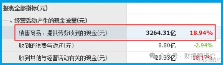 然而,翻到现金流量表,故事的画风突变。销售商品收到的现金高达3264.31亿元,同比增长18.94%,几乎与营业收入相当。